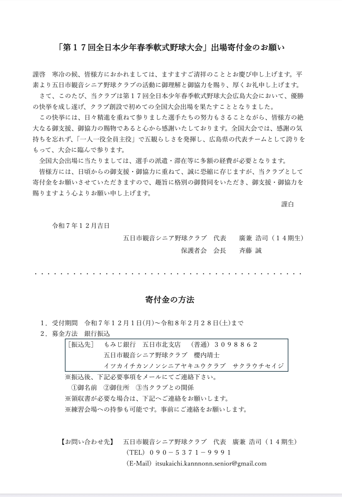 「第17回全日本少年春季軟式野球大会」出場寄付金のお願い